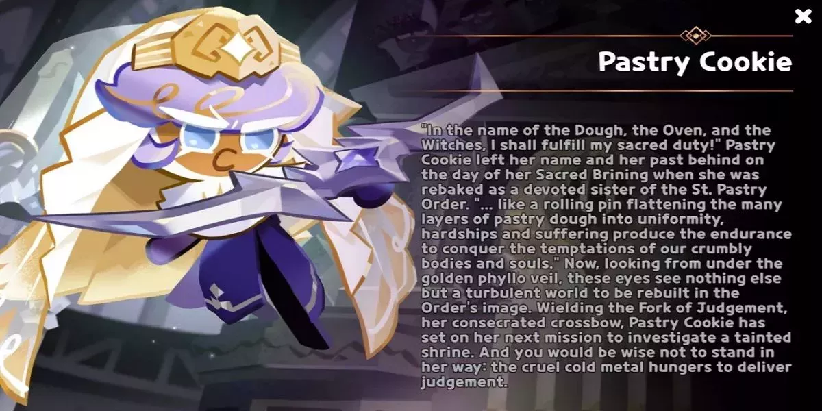 Aoi Koga da voz a Pastry Cookie, una poderosa atacante de retaguardia que está totalmente entregada a la Orden de San Pastel. Su voz para Pastry Cookie es similar a la de Komi, siendo suave y aguda, aunque en este papel brilla más confianza.