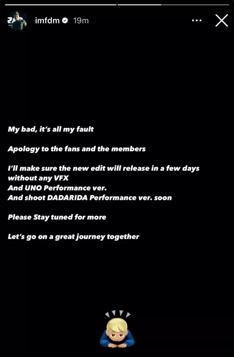 "Culpa mía, todo es culpa mía", escribió en inglés en un Instagram Story. "Disculpas a los fans y a los miembros. Me aseguraré de que la nueva edición salga en unos días sin ningún VFX. Por favor, permaneced atentos para más".