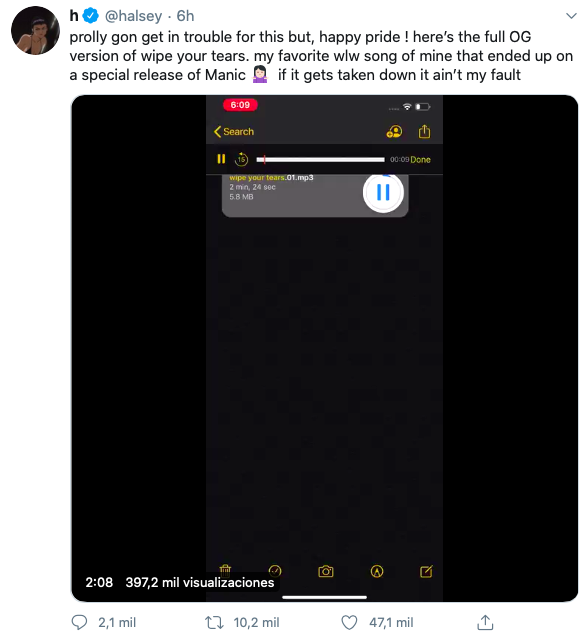 "Prolly se va a meter en problemas por esto pero, ¡feliz orgullo! Aquí está la versión completa de OG de "Limpia tus lágrimas". Mi canción favorita de wlw que terminó en un lanzamiento especial de Manic ????????♀ si la quitan no es mi culpa"