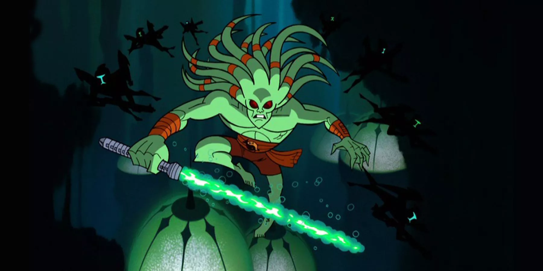 Kit Fisto lleva sables de luz bajo el agua en Mon Cala durante la película de dibujos animados Star Wars: Clone Wars. Sin embargo, varios Jedi, desde Ahsoka Tano a Luke Skywalker, encontraron que sus sables de luz eran impermeables. Esto se debe a una modificación del sable láser que, al menos en Legends Canon, el propio Kit Fisto inventó. Se llama Pulso Bifurcante de ignición cíclica. Este aumento utiliza dos cristales para crear una carcasa impermeable para proteger el sable láser del agua. De lo contrario, los circuitos se cortocircuitarían, causando que la hoja se disipe.