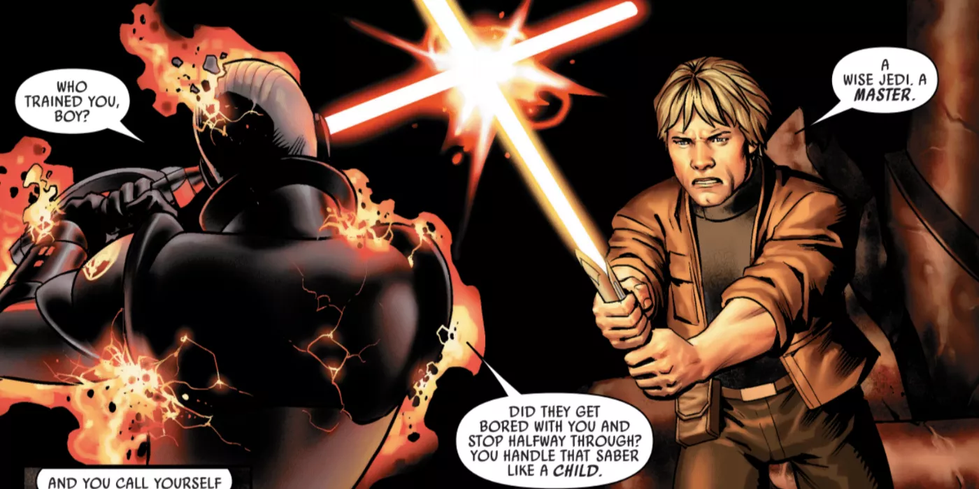 En una galaxia muy, muy lejana, Luke Skywalker es conocido por manejar dos tipos de sables de luz: El azul de su padre y el verde que construyó para sí mismo cuando finalmente se convirtió en un Caballero Jedi. Pero en Star Wars #6, Luke adquiere un nuevo sable láser en el intervalo entre la pérdida del sable Skywalker y la construcción de su propio sable láser. Este sable en particular fue usado por un guardia del templo Jedi y le dio a Luke un nuevo color para usar: el amarillo. Pero aunque Luke puede haber reclamado un nuevo sable de luz lleno de tradiciones de Star Wars, también hizo un clásico cañón de juguete.