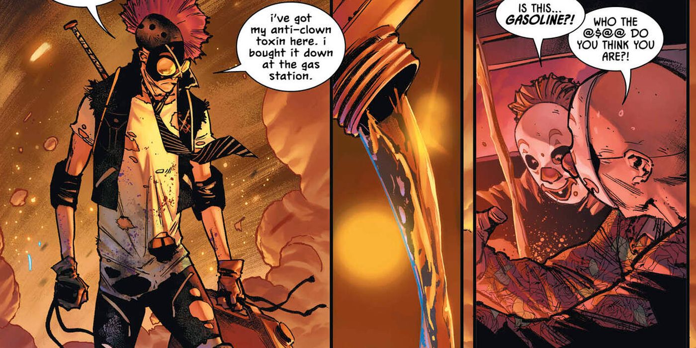 Empieza ahora.Con sus principales defensores preocupados, con el cerebro lavado o completamente neutralizados, esto ha dejado a muchos ciudadanos de Gotham a valerse por sí mismos mientras el ejército personal del Guasón corre por las calles de la ciudad. Un vecindario, sin embargo, ha encontrado su propio héroe improbable en el nuevo vigilante, Clownhunter. Después de haber crecido en los Narrows, el barrio más rudo y peligroso de Ciudad Gótica, Clownhunter hizo su debut rescatando a una madre y a su hijo de algunos de los secuaces del Guasón, matando a los matones del Guasón con un Batarang que sobresalía de un bate de béisbol, visiblemente desquiciado y empleando abiertamente una fuerza letal.