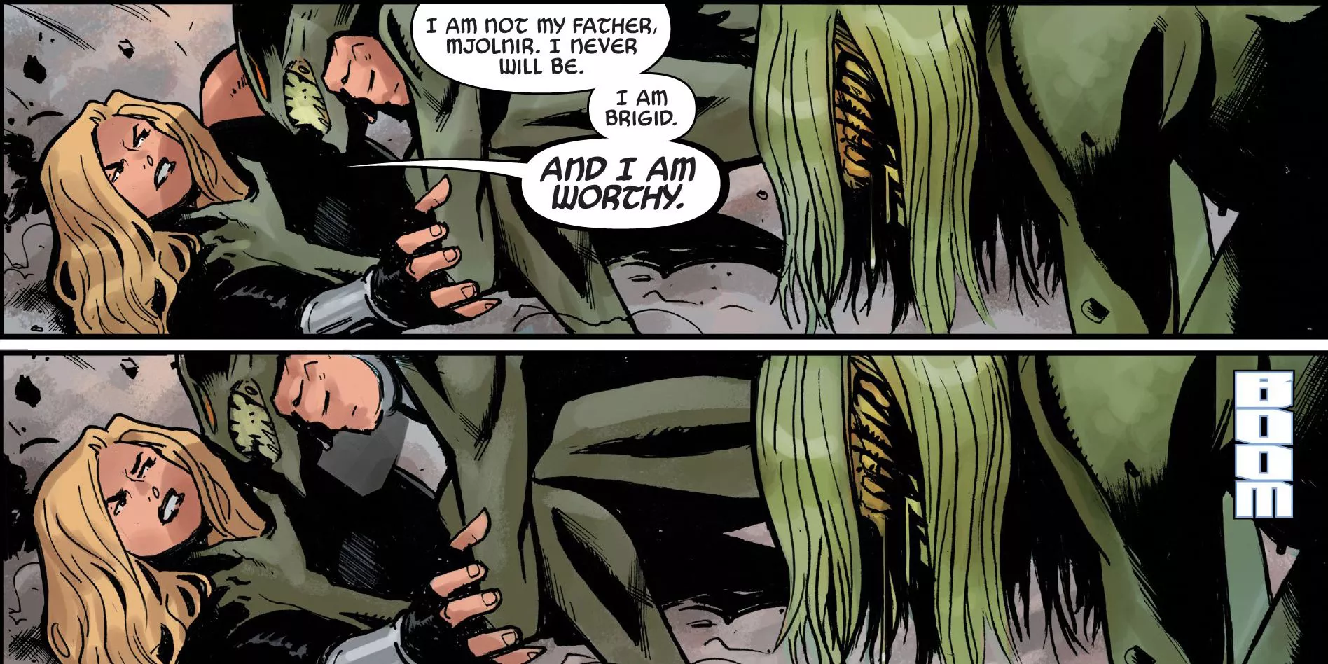 Entre ellos estaban Gerry Drew, hijo de Jessica Drew, Rhodes, hija de Máquina de Guerra, y Kate Barton, hija de Ojo de Halcón y Viuda Negra, entre otros. Y quizás lo más destacable es que el grupo también presentó a Brigid, la hija de Thor. Estos héroes se unieron al Capitán Marvel en la batalla cuando se enfrentaron al hijo de Namor y Encantadora, Ove, y sus fuerzas demoníacas, pero fueron derrotados. Ahora, en Captain Marvel #25, Brigid vuelve a luchar y consigue su propio momento de Capitán América.