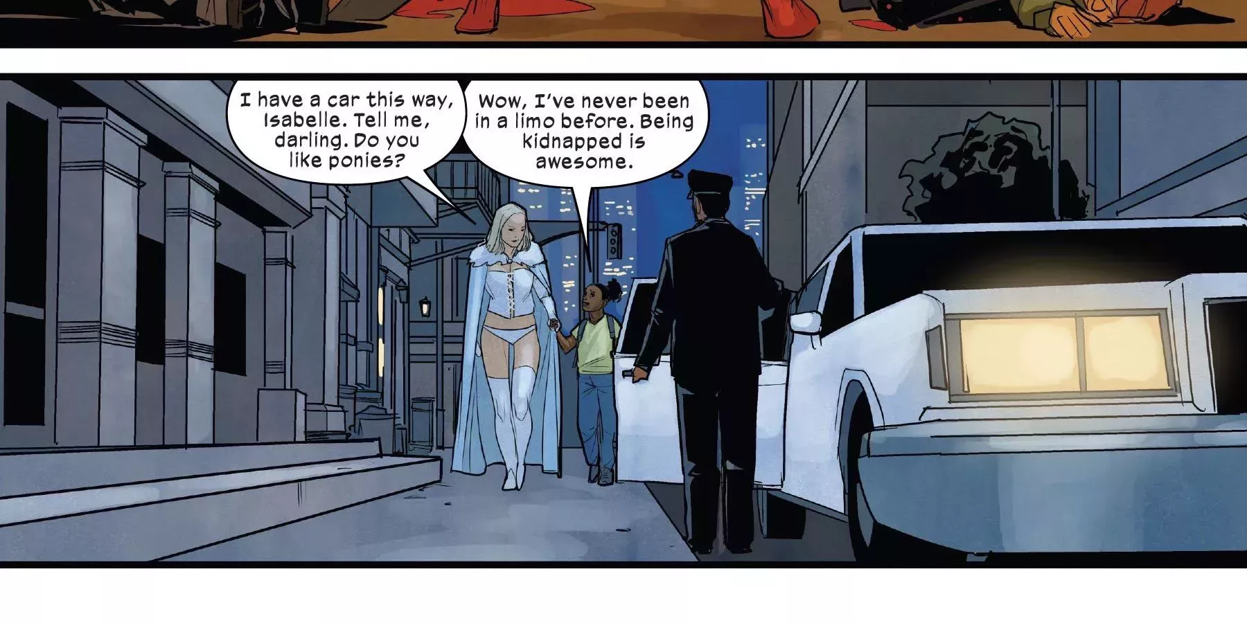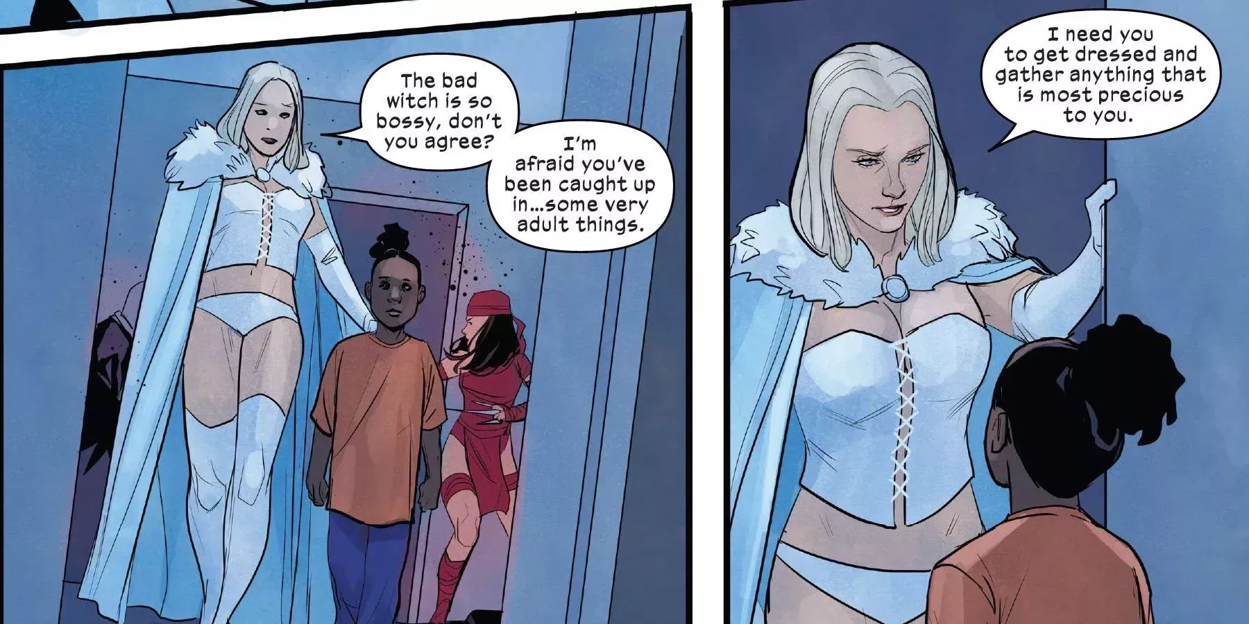 Devil's Reign: X-Men #2 muestra la verdadera historia de lo que ocurría en la foto. Elektra se había reunido con Emma y le dijo que un niño había presenciado uno de sus asesinatos y le pidió a la mutante psíquica que borrara el recuerdo del traumático suceso de la mente del niño. Aunque en aquel momento todavía se la consideraba un miembro villano del Club Fuego Infernal, Emma accedió a ayudar al niño y se marchó a Inglaterra para escapar de sus negligentes padres adoptivos. Fisk utiliza la foto para sugerir que Emma secuestró y puso en peligro a la niña, cuando en realidad la estaba rescatando.