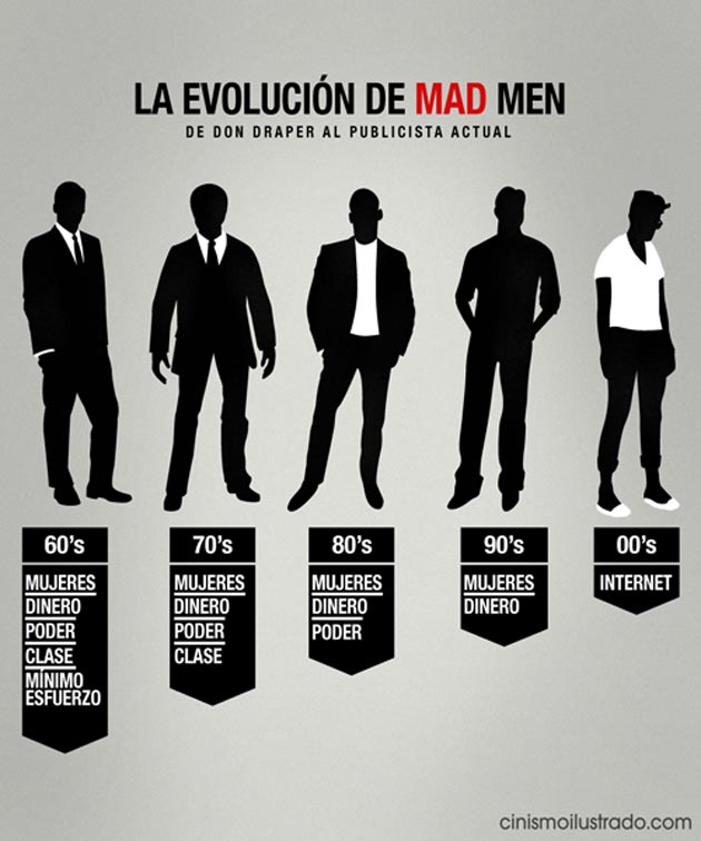 Tenemos síndrome de Mad Men abstinencia, eso es así. Y por eso somos altamente receptivos a este tipo de imágenes que evocan la estética que la serie ha creado. Y es cierto: la imagen del publicista ha evolucionado del dandy elegante al típico creativo desenfadado actual. Por eso nos ha gustado mucho esta imagen de Cinismo ilustrado.