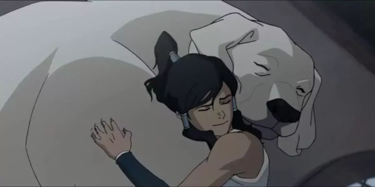 Una de las relaciones más dulces que tiene Korra es con su perro oso polar, Naga. Conoce a Naga cuando la joven cachorra se separa de su manada en una tormenta. Korra la alimenta y juega con ella, y las dos se acercan lo suficiente después de esa noche para acurrucarse juntas.