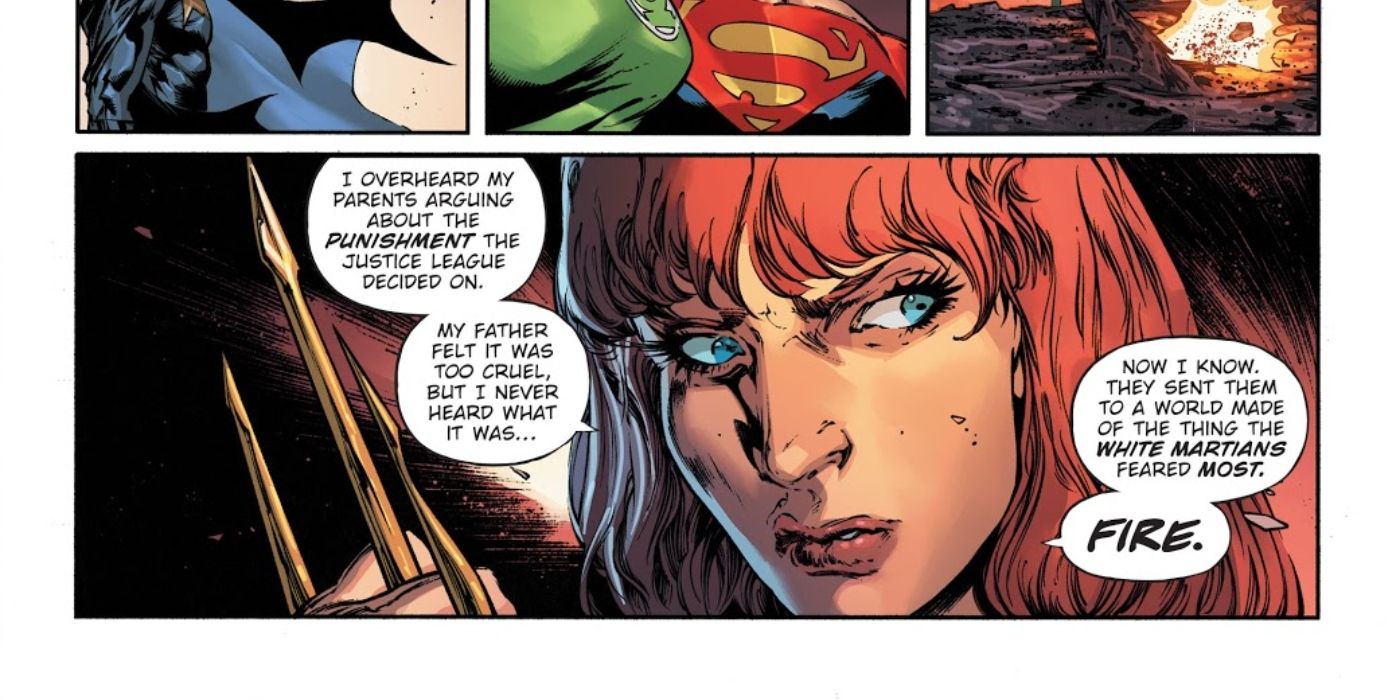 Pero Aquawoman resumió por qué este lugar era la prisión perfecta para los marcianos blancos: era un planeta de fuego, la mayor debilidad de la especie marciana. Al parecer, la última vez que el Hiperclan había atacado a la Liga de la Justicia fue su ataque más brutal. La Liga de entonces decidió que había que contener al Hiperclan en algún lugar que limitara sus capacidades y asegurara que nunca volvieran. Se decidieron por este mundo en llamas, pero Aquawoman reconoció que Aquaman había pensado que este "castigo" era demasiado cruel.