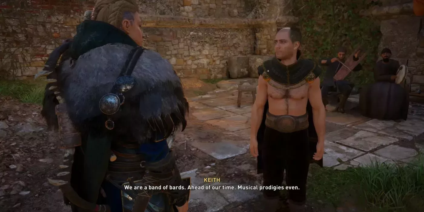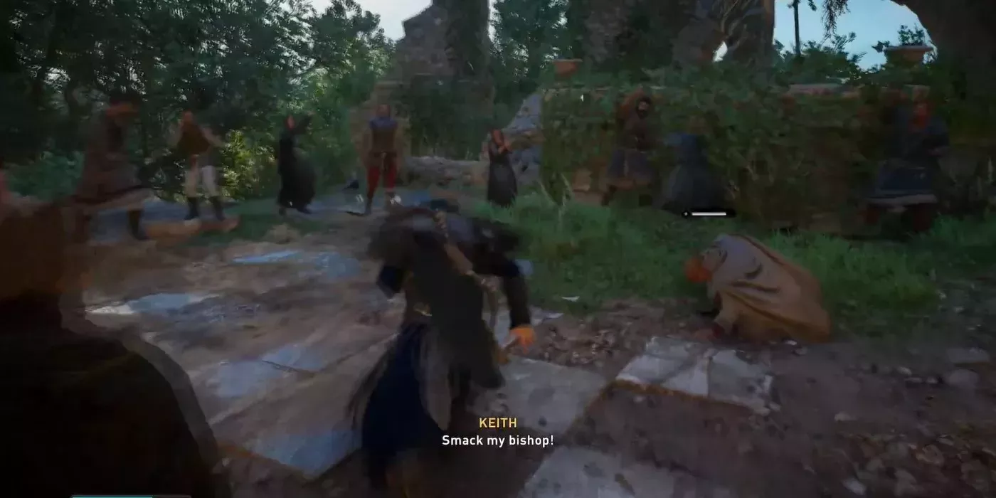 Una vez que Eivor llega al lugar de la búsqueda, se encuentran con un hombre llamado Keith que está tocando música con sus amigos. Le explica a Eivor que el obispo de su zona no les deja tocar y llama a su canto "gaitas del diablo". Eivor, que cree en la libertad de expresión, va a hablar con el obispo. En su encuentro, el obispo le explica cómo su papel le fue dado por Dios mientras estaba borracho y cree que es su deber alejar a la gente de la banda. Esto hace que Eivor se enfrente a él, mientras Keith se cierne en el fondo animando a Eivor a "¡golpear a mi obispo!".