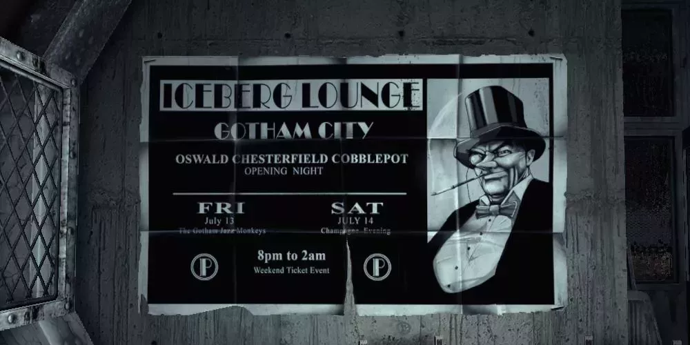 Cuando se muestra el centro de Gotham, en el fondo está el Iceberg Lounge. El Iceberg Lounge es en realidad un club nocturno propiedad del Pingüino. Es uno de sus intentos de aparentar legitimidad en sus empresas, aunque a menudo sirve como base de operaciones más que como empresa legítima.