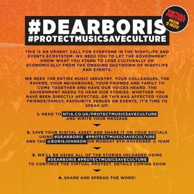 En apoyo a la audiencia parlamentaria de hoy, la NTIA también ha lanzado una protesta virtual #DearBoris para que el gobierno sepa lo que la gente de la industria puede perder cultural o económicamente por el cierre continuo de la vida y los eventos nocturnos.