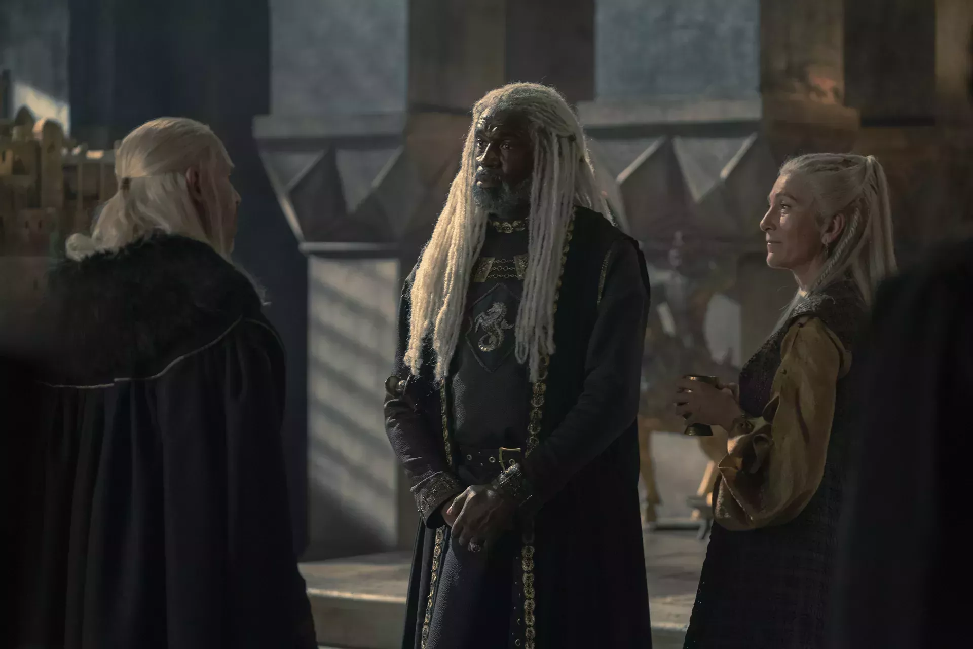Del mismo modo, Daemon vive una vida cómoda en el exilio, pero también siente la embriagadora atracción de una guerra en el extranjero. Cuando el Príncipe de Pentos (TBD) le pide a Daemon que se involucre en la lucha contra la Triarquía, éste se siente tentado. "Una simple transacción: nosotros tenemos dragones, ellos tienen oro", le explica a su esposa, Laena (Nanna Blondell). La falta de apuestas atrae a Daemon a la idea. "No tenemos responsabilidad. Los tejemanejes políticos, los interminables cambios de lealtad y sucesión, no son nuestros".