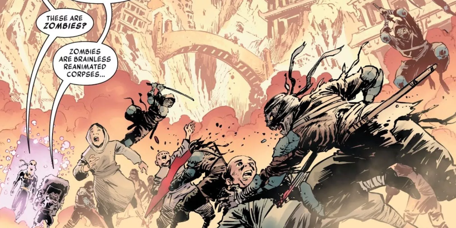 La mayoría de los artistas marciales de la actual lista de Vengadores también luchan contra los muertos vivientes en la historia de los Vengadores del año pasado "The Age of Khonshu", de Jason Aaron, Ed McGuinness, Javier Garron y Francesco Mannon, aunque en este caso luchan contra momias. El Capitán América, Blade y Pantera Negra se abren paso a puñetazos entre estos cadáveres resucitados (al igual que otros héroes menos entrenados en la lucha cuerpo a cuerpo).