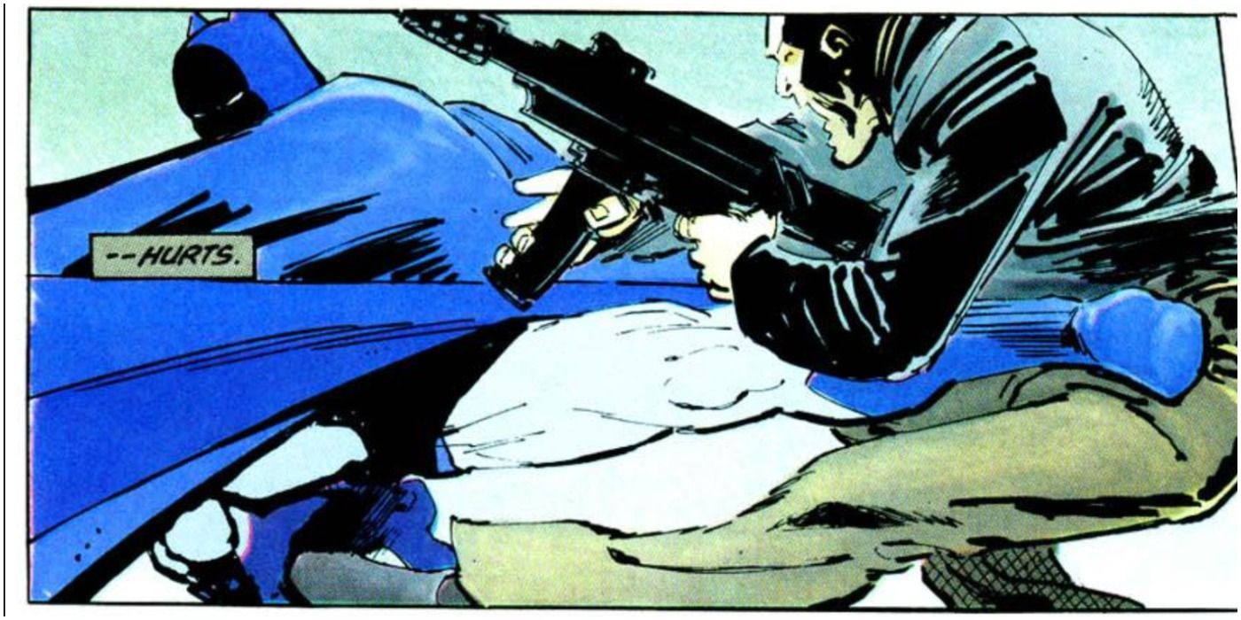 Las secuelas de la lucha en el TDKR descritas anteriormente muestran la brutalidad de Batman incluso más que la "lucha" unilateral en sí misma. Abalanzándose sobre el matón después de patear su columna vertebral fuera de lugar, Batman comienza a asar al matón. Cuando un policía novato que blande su arma intenta arrestar a Batman, proclamando que el hombre que está debajo de él probablemente ha sido herido de forma permanente, Batman ni siquiera se acobarda.