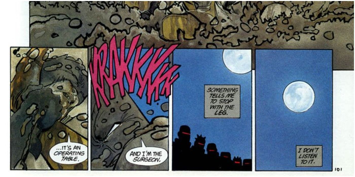 Desde allí, Batman lo hiere miembro por miembro mientras su ejército de seguidores mira y se inclina al lado de Batman en el proceso. Como muestra el monólogo interno, el Caballero Oscuro de Miller carece incluso del fugaz remordimiento por la violencia que expresa el Batman de Starlin.