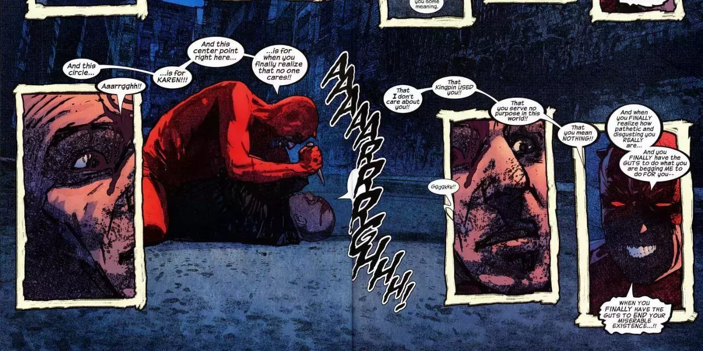 Daredevil tiene fama de ser un combatiente feroz, y ha causado graves daños a sus enemigos. Sin embargo, rara vez recurre a la mutilación de personas. En el número 49 de Dar edevil -de Brian Michael Bendis, Alex Maleev, Matt Hollingsworth y Cory Petit- recurrió a métodos más brutales.