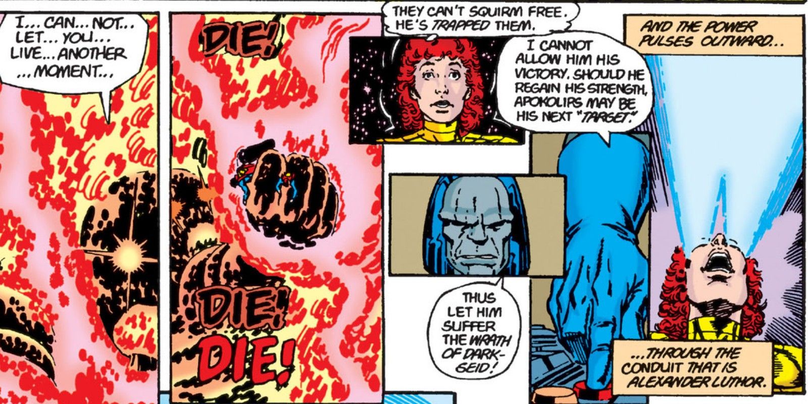 En la batalla final contra el Antimonitor, cuando parece que toda la realidad será borrada, Darkseid utilizó a Alexander Luthor como su sustituto, enviando su poder a través del niño genio de Tierra-Tres, destruyendo completamente la forma física del Antimonitor, dejando al asesino del multiverso enfrentarse a su destino final a manos de Superman.