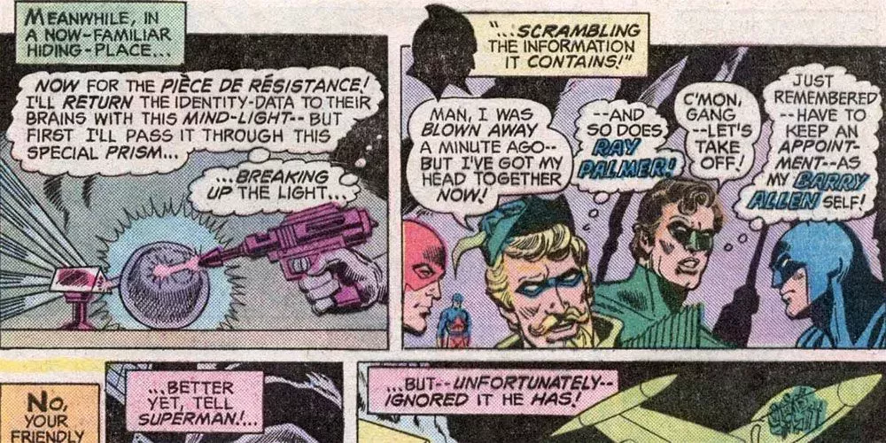 Justice League of America #122 fue un caso secreto de la Liga de la Justicia. Martin Pasko, Frank McLaughlin y Dick Dillin explicaron a los lectores por qué la JLA conocía las identidades secretas de los demás en esta historia sobre un plan urdido por el Doctor Light en el que utilizó el mineral Amnesium para robar el conocimiento de sus identidades a cinco héroes. De forma desconcertante, cambió sus recuerdos de forma aleatoria.