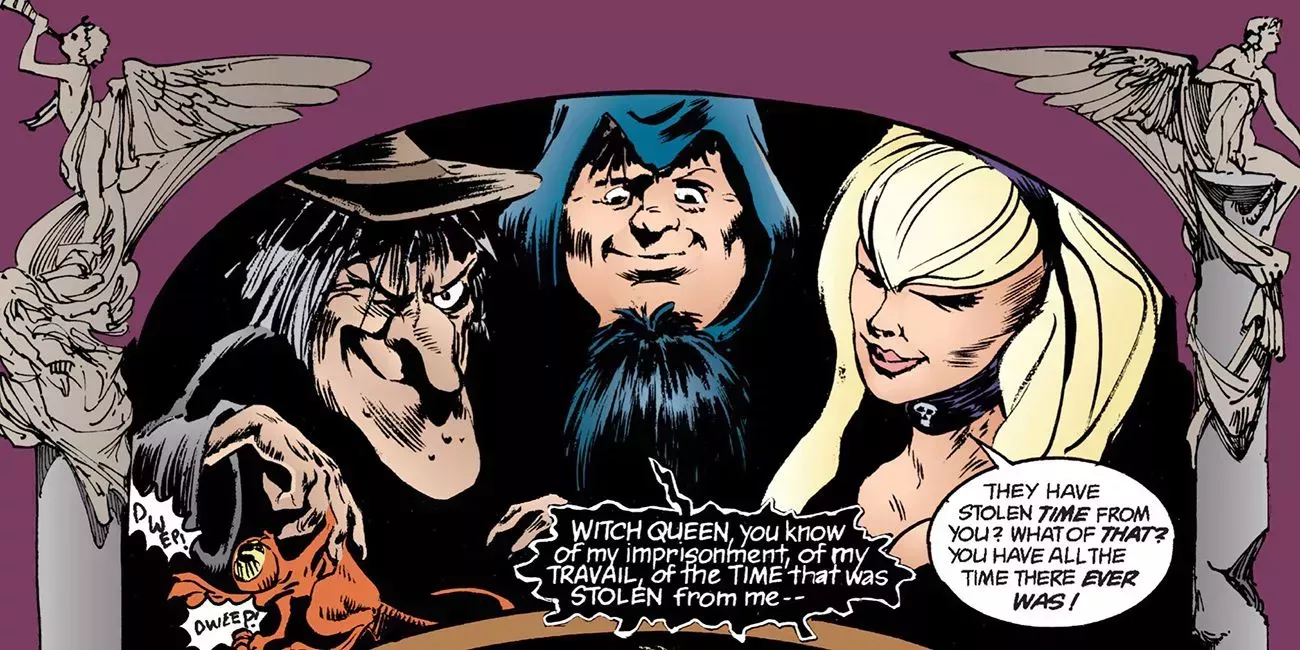 El mito más extraño que cobra vida en el estreno de la épica gótica de DC Comics es el de los hados. Las Tres Que Son Una es un ser conglomerado, compuesto por tres brujas, un motivo que aparece en varias mitologías diferentes. Shakespeare las llamó las Hermanas Extrañas, nombre que Dream utiliza junto con las Amables, las Damas Grises y Hécate.