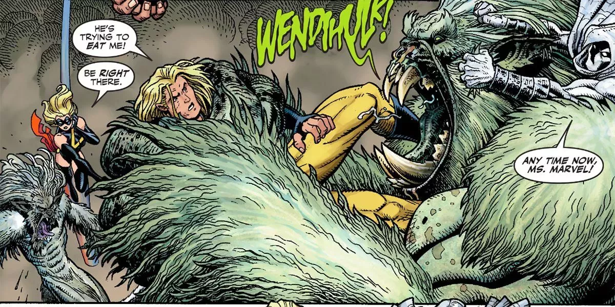 Esa batalla es hermosamente triste de una forma que probablemente no se repetirá dados los posteriores cambios de Marvel en el mito. En Hulk #9, un enjambre de wendigos mordió a Hulk, convirtiéndolo en el voraz Wendihulk. Sin embargo, Hulk ha comido gente antes, así que es posible que las nuevas reglas basadas en los hombres lobo sean falsas y que cualquiera que haya sido maldecido haya comido carne humana.