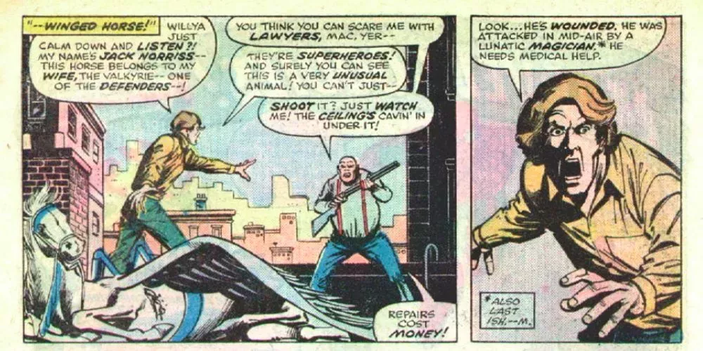 El momento más extraño de este Pegaso llegó en Defenders #36, escrito por Mary Skrenes y Steve Gerber con lápices de Sal Buscema y arte de Klaus Janson. Un neoyorquino armado con una escopeta amenazó con disparar a Pegaso, entonces Hulk apareció de la nada y arrojó al hombre del edificio porque "Caballo es amigo de Hulk" Los Defensores siempre fueron extraños, pero el extravío de Pegaso solo los hizo más raros.