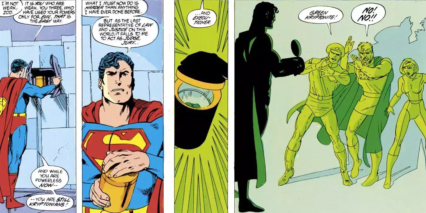 Sin embargo, continuaron amenazando a Superman. Afirmaron que encontrarían la forma de recuperar sus poderes, entrar en el universo de Superman y destruir su mundo. Superman los expuso entonces a la kriptonita verde, matándolos a todos. Es un momento único en el que Superman ejecuta a unos prisioneros indefensos, que no suponían ninguna amenaza en ese momento.