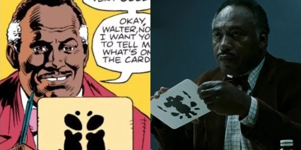 Inspirándose en los personajes de Charlton Comics, Alan Moore y Dave Gibbons los combinaron con sus propias ideas para crear Watchmen.La película y el cómic presentan el primer asesinato de Rorschach, pero se desarrollan de forma tan diferente que la escena de la película bien podría no existir. En la novela gráfica, Rorschach persigue a Gerald Anthony Grice por matar a un niño. El justiciero encadena al hombre a una tubería y le da una sierra de mano, que menciona que no funcionaría con sus ataduras. A continuación, Rorschach rocía la habitación con queroseno y le prende fuego.