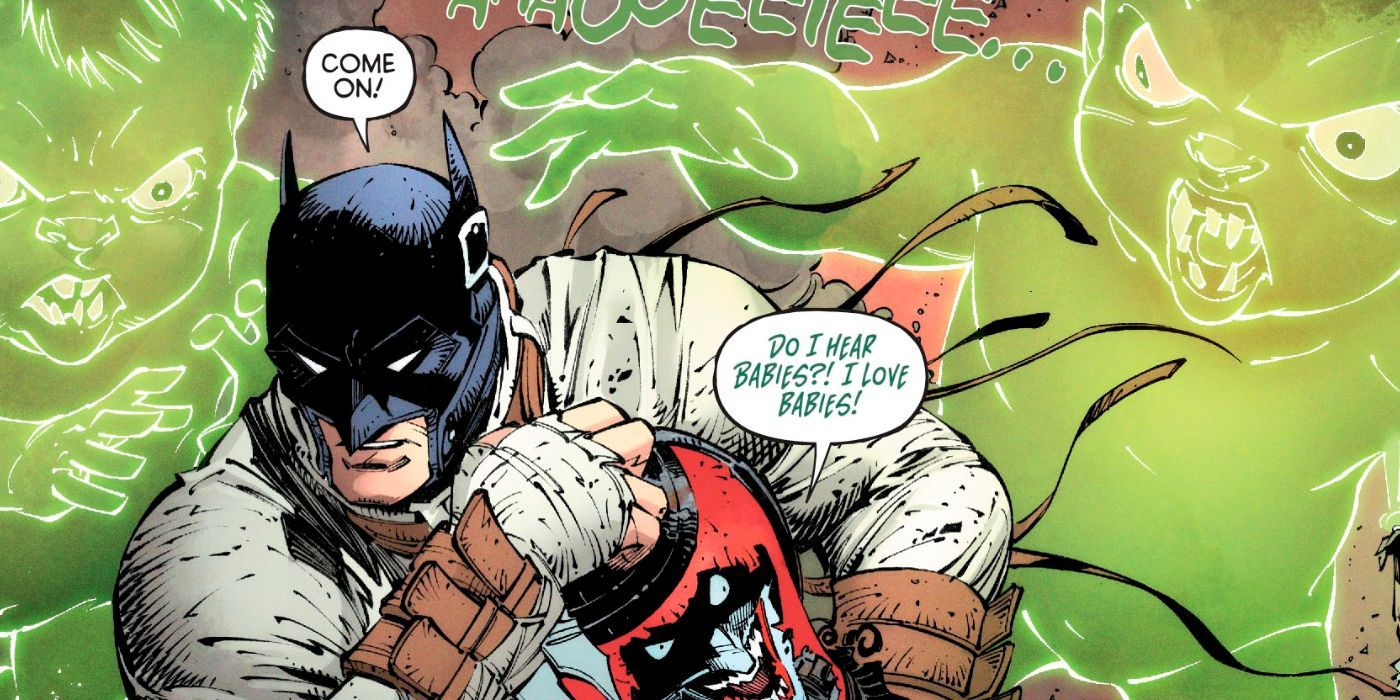 Pero Batman: El último caballero en la Tierra es un poco diferente en cuanto al escenario. En primer lugar, está situado en un vasto terreno baldío perseguido por zombis y enormes bebés verdes. Y luego está la cabeza del Guasón en un frasco de cristal, añadiendo sus bromas y lanzando huevos a Batman, mientras marcha hacia una Gótica en ruinas, hacia un enigmático enemigo llamado Omega.