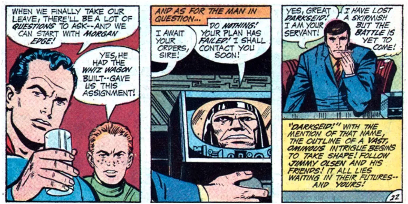 La serie de Kirby sobre Jimmy Olsen, compañero de Superman , es en su mayor parte accesoria a su Saga del Cuarto Mundo . Sin embargo, el segundo número de su carrera, el 134, es la primera aparición de Darkseid; la página final del número revela que el villano de la historia, Morgan Edge, era un peón de Darkseid.