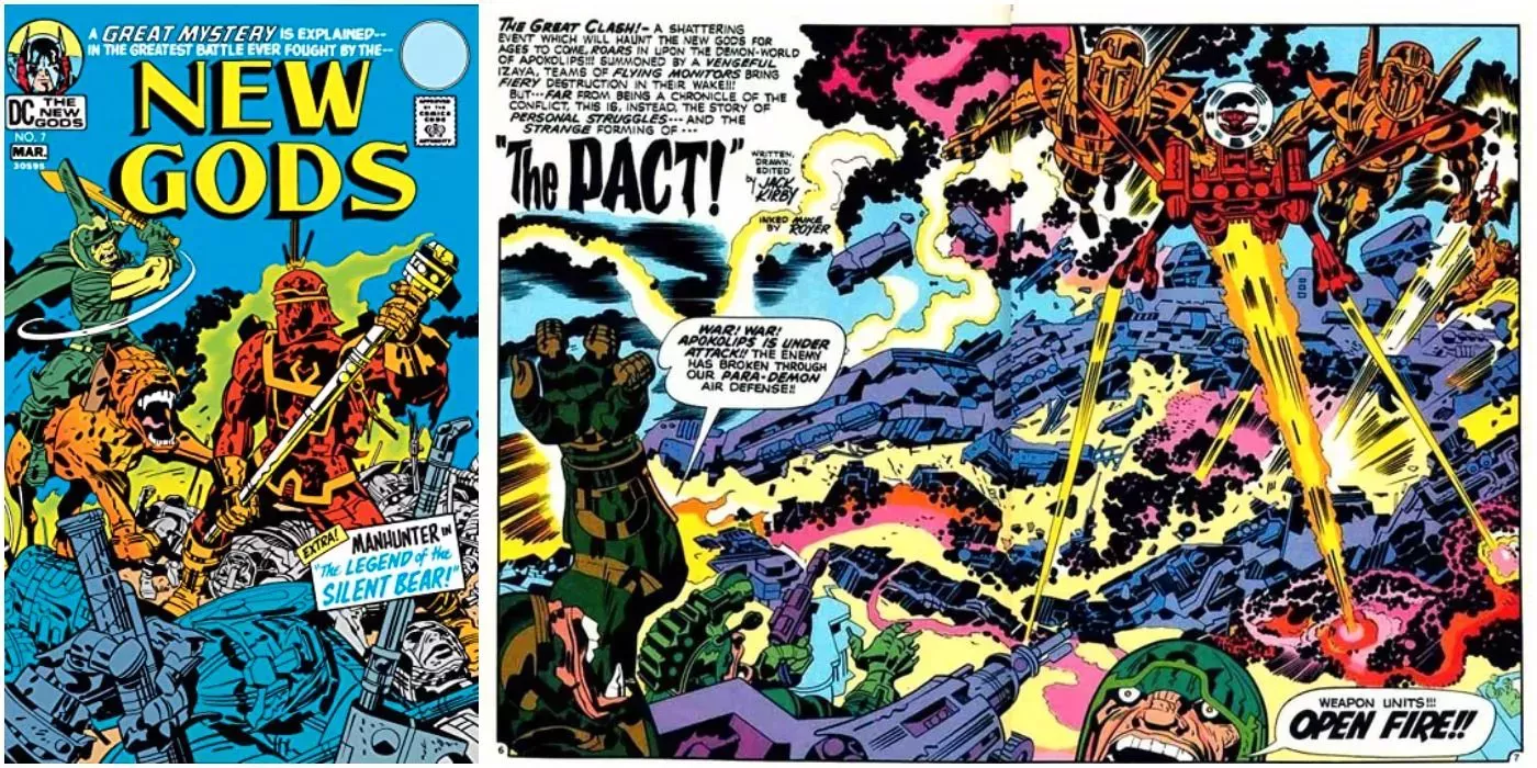New Gods #7, o "El Pacto", es el eje de la Saga del Cuarto Mundo. Contada en su totalidad como un flashback, la historia expone los antecedentes del Cuarto Mundo y da seguimiento a las pistas esparcidas en los números anteriores. "El Pacto" comienza en una época anterior a que Darkseid gobernara Apokolips y Highfather dirigiera Nueva Génesis; la muerte de Avia, la joven esposa de Highfather, a manos del general apokoliptiano/tío de Darkseid, Steppenwolf, da inicio a una guerra entre los dos planetas.