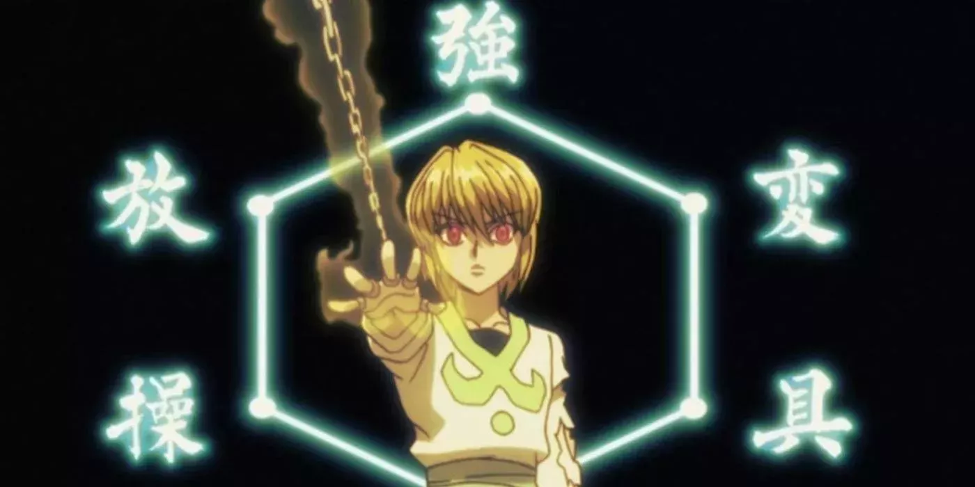En Hunter X Hunter, las cadenas de Kurapika le permiten conjurar cinco cosas diferentes con su Nen. La cadena del pulgar se llama Cadena Sagrada. Permite a Kurapika curar heridas. La cadena del dedo índice le permite robar el poder de otra persona. La cadena del dedo corazón se extiende para atrapar a uno de sus enemigos. En el dedo anular lleva la cadena de la radiestesia, que le permite encontrar algo o a alguien desaparecido e incluso detectar mentiras.