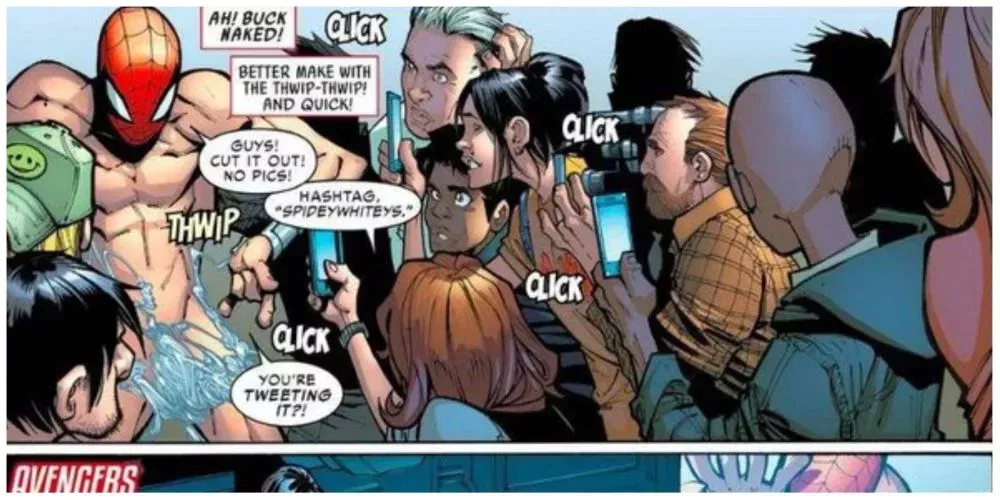En el número, un Spiderman de 15 años se enfrenta a Skein: un villano que puede manipular cualquier tejido de la Tierra. Los resultados del encuentro dejan a spidey en su traje de cumpleaños mientras un grupo de periodistas le bombardea con más preguntas de las que le interesa explicar. La vergüenza de Spider-Man fue transmitida y tuiteada por toda el área metropolitana de Nueva York, llamando incluso la atención de sus compañeros de equipo de los Vengadores.