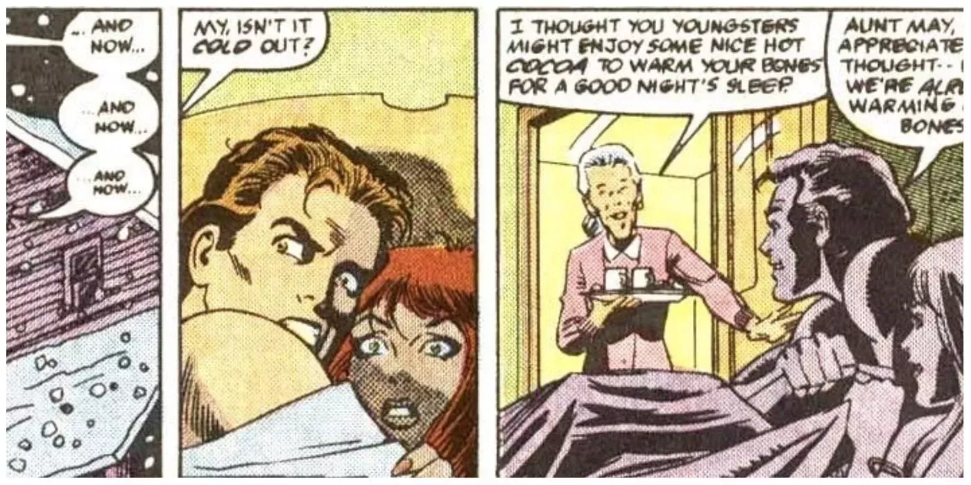Durante una tormenta de nieve, May entra sin avisar en el dormitorio de Peter y MJ para entregarles chocolate caliente, perturbando un acto de intimidad. El shock de ser visto por su tía no sólo fue humillante para Peter sino para todas las partes involucradas.