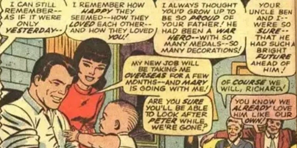 La primera tragedia de la vida de Peter Parker ocurrió antes de que pudiera formar recuerdos. Los padres de Peter, Richard y Mary Parker, murieron en lo que se creía que era un accidente de avión, pero en realidad fue un asesinato a manos de los Cráneos Rojos. Durante gran parte de la vida de Peter, la verdad sobre el pasado de sus padres se mantuvo oculta para él. No sabía que eran espías que trabajaban con Nick Fury. La muerte de los padres de Peter lo dejó en manos de su mucho mayor tía May y su tío Ben.