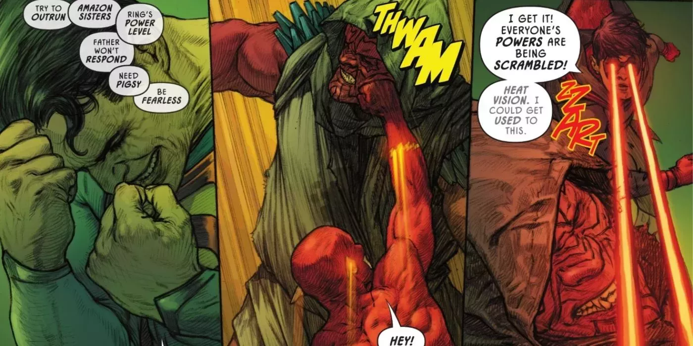 A continuación, el equipo vio sus propias habilidades alteradas, con confusiones como la telepatía de Superman y la visión calorífica de Robin. La lucha final estuvo cargada de momentos épicos y contó con el heroico sacrificio de Alicia Negra por los demás. También terminó con la sorprendente revelación de que Nezha había poseído a Batman.