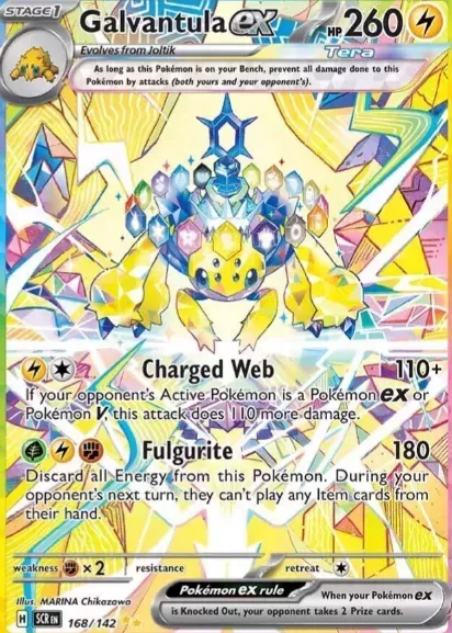 Galvantula ex es un Pokémon de tipo Eléctrico de 260 CV que también tiene el rasgo Tera. Esto le permite aprovechar las nuevas cartas de apoyo como Briar y Área Cero Profundidades. Su segundo ataque, Fulgurite, cuesta una Energía Hierba, una Energía Rayo y una Energía Lucha. Cuando se utiliza su ataque, los jugadores deben eliminar toda la energía de Galvantula ex, pero el rival no puede jugar cartas de objeto en el turno siguiente. Este ataque bloquea cartas cruciales y no permite al oponente tomar represalias con objetos cruciales como Prime Catcher y Counter Catcher. Puede ser frustrante jugar contra mazos de aturdimiento, y Galvantula ex es uno de los ejemplos más molestos de este estilo de juego.