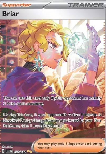 Briar establece que si al oponente le quedan exactamente dos cartas de premio y un jugador elimina al Pokémon activo del oponente, se lleva una carta de premio adicional. Esto permite a mazos como Charizard ex y Dragapult ex asegurar la partida más rápido contra mazos de un solo premio como Luna Rugiente y Caja Antigua. En general, aunque esta carta es situacional, es de lejos la opción de apoyo más intrigante lanzada en Corona Estelar.
