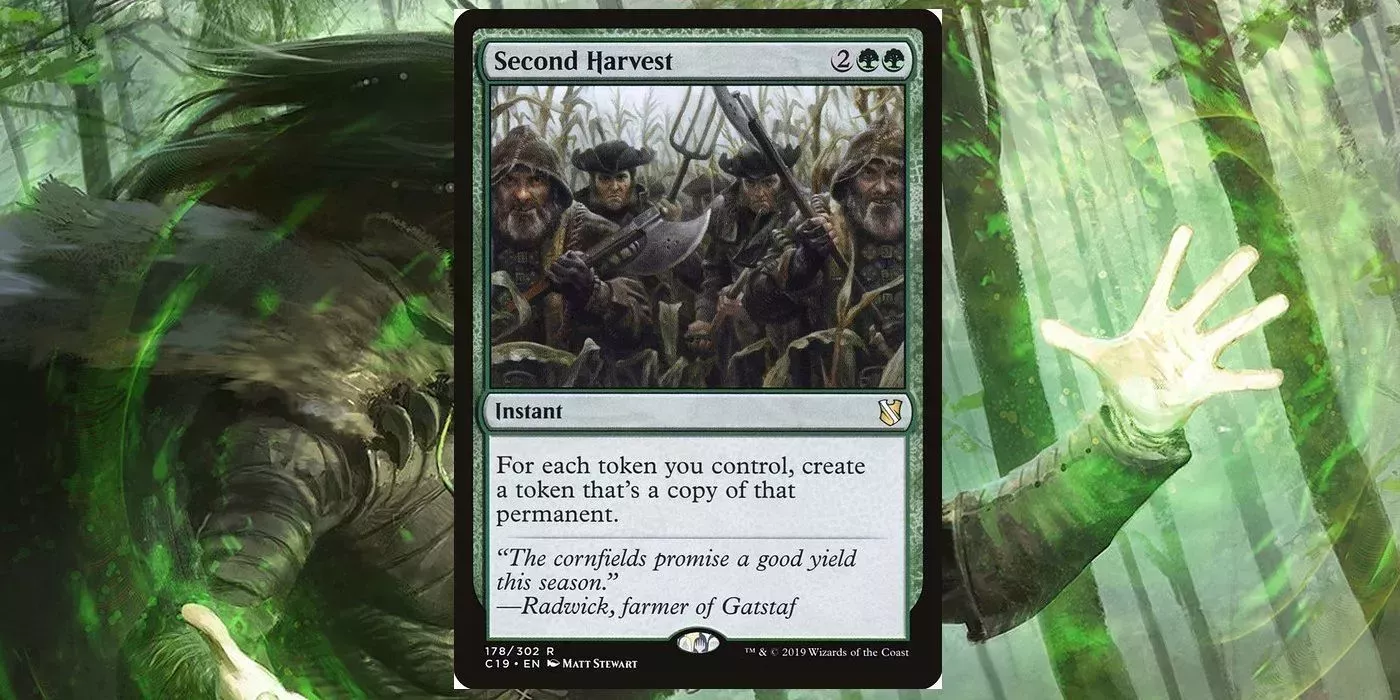 Mientras que Vidas paralelas es sin duda la mejor carta para los mazos con muchas fichas, como los tribales élficos, Segunda cosecha también tiene su utilidad. Segunda cosecha es un ejemplo de hechizo natural poderoso que puede acelerar cualquier estado del tablero que ya esté lleno de fichas de criatura.