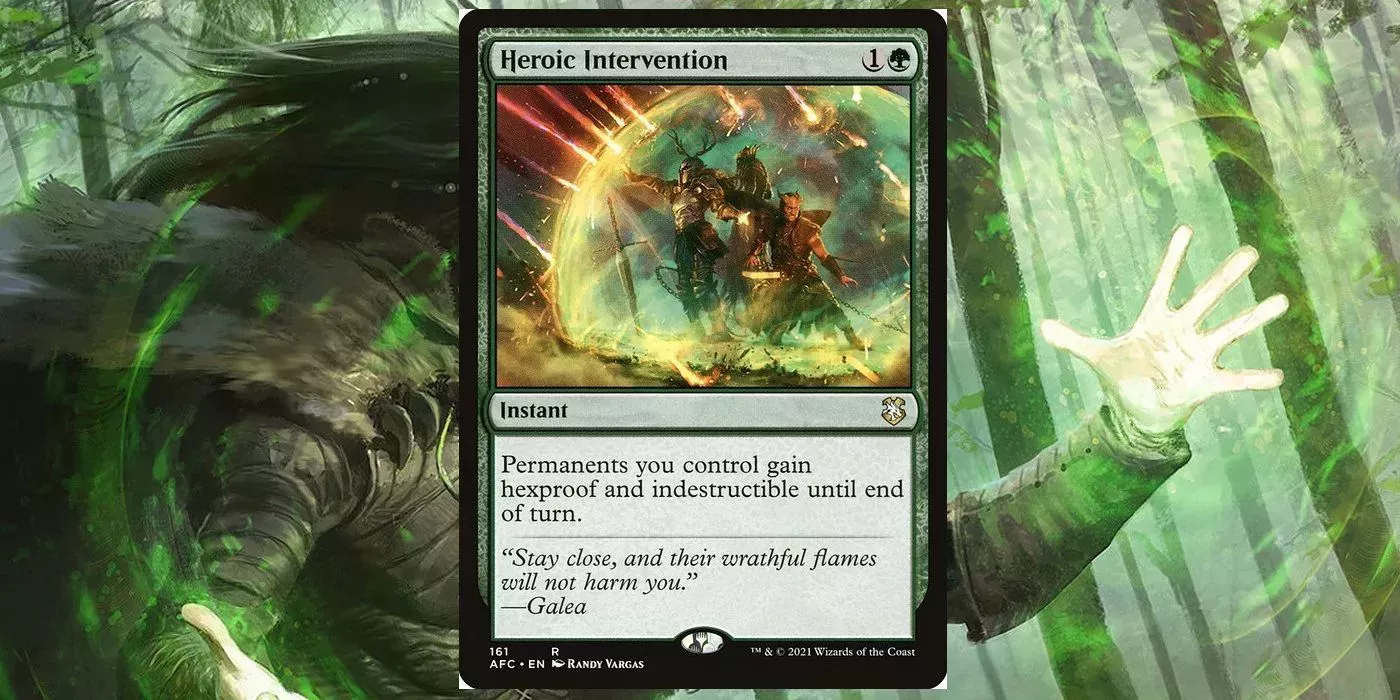 Intervención heroica es un instantáneo bastante caro pero enormemente poderoso que puede salvar todo un tablero de la destrucción. Este truco de combate verde barato se usa mucho en Commander, y eso incluye mazos tribales élficos como los de Ezuri y Rhys.