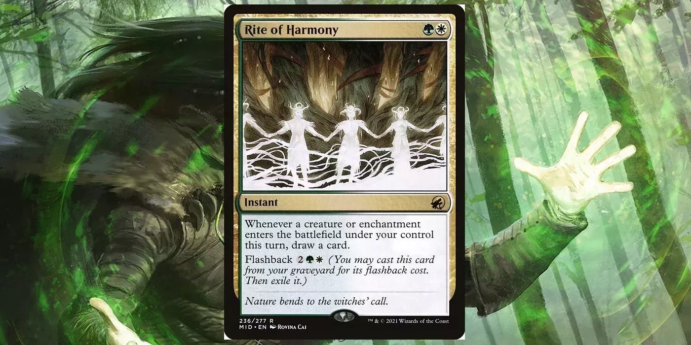 Rito de armonía es un hechizo barato que representa la sabiduría druídica de la tribu élfica. Con él, un mazo élfico robará muchas cartas, incluso fichas de criatura, por no hablar de los encantamientos. Rito de armonía también puede volver a aparecer más tarde, cuando el jugador disponga del maná necesario.