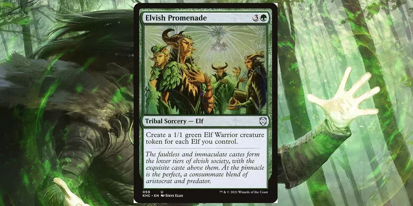 Paseo élfico es un hechizo tribal de cuatro lanzamientos que simplemente crea una ficha de criatura élfica 1/1 por cada élfico que el jugador ya tenga. Esto, junto con hechizos como Segunda cosecha, puede duplicar fácilmente un gran tablero de elfos y ejercer una presión abrumadora sobre el oponente.