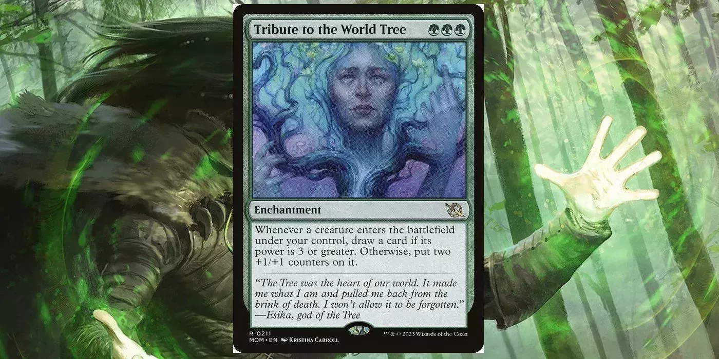 Tributo al Árbol del Mundo es una nueva carta para los mazos tribales élficos, que aparece en la reciente expansión Marcha de la Máquina . Este encantamiento verde beneficiará enormemente a todas las criaturas que entren en el campo de batalla, sean fichas o no, pero de formas diferentes.