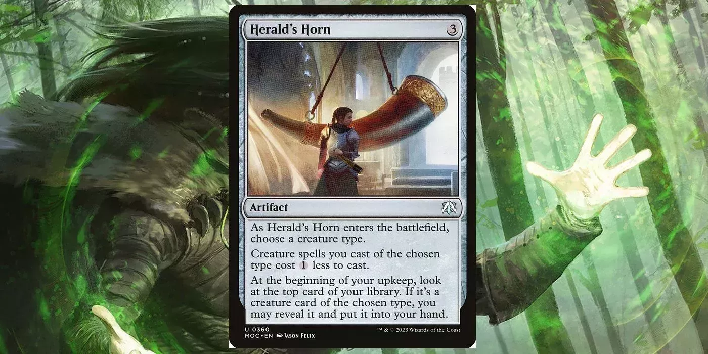 El Cuerno del heraldo es un poco lento para los mazos competitivos de MTG , y muchos mazos casuales tampoco lo usan. Sin embargo, los mazos tribales de Commander suelen usar Cuerno de heraldo, ya que acumula valor con el tiempo, se puede lanzar con cualquier tipo de maná y puede beneficiar a cualquier tribu.