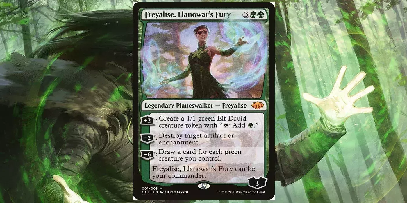 Freyalise, Furia de Llanowar es una Planeswalker verde que representa a uno de los personajes legendarios más icónicos y populares del juego. Freyalise puede funcionar bien en una gran variedad de mazos verdes, pero los mazos élficos le sacan un partido extra, ya que la habilidad +2 de Freyalise convierte en un druida élfico.