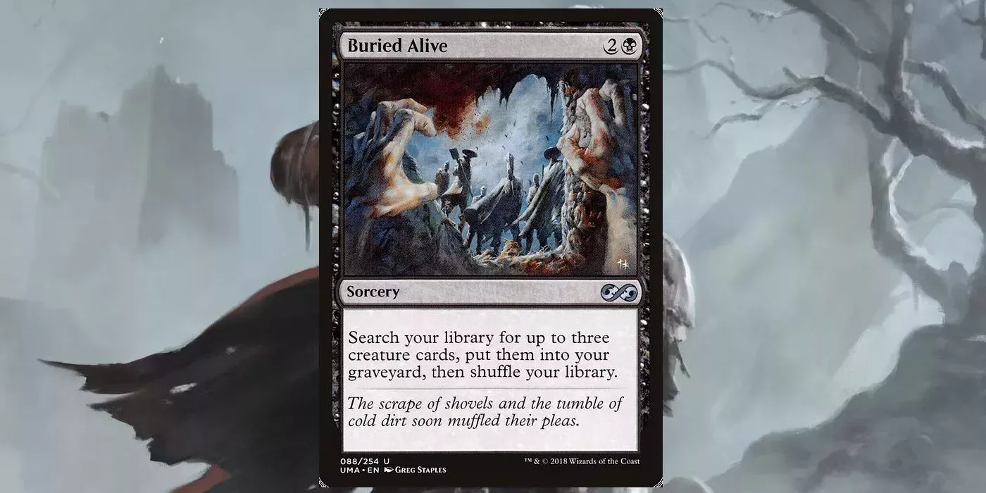 Enterrado Vivo es una versión diferente del efecto "tutor", o cuando un jugador busca en su mazo una carta en particular y la pone en la mano. Enterrado vivo representa a los crueles magos que ponen a sus vÃctimas en la tumba para reanimarlas más tarde, y es un gran hechizo de temática zombi.
