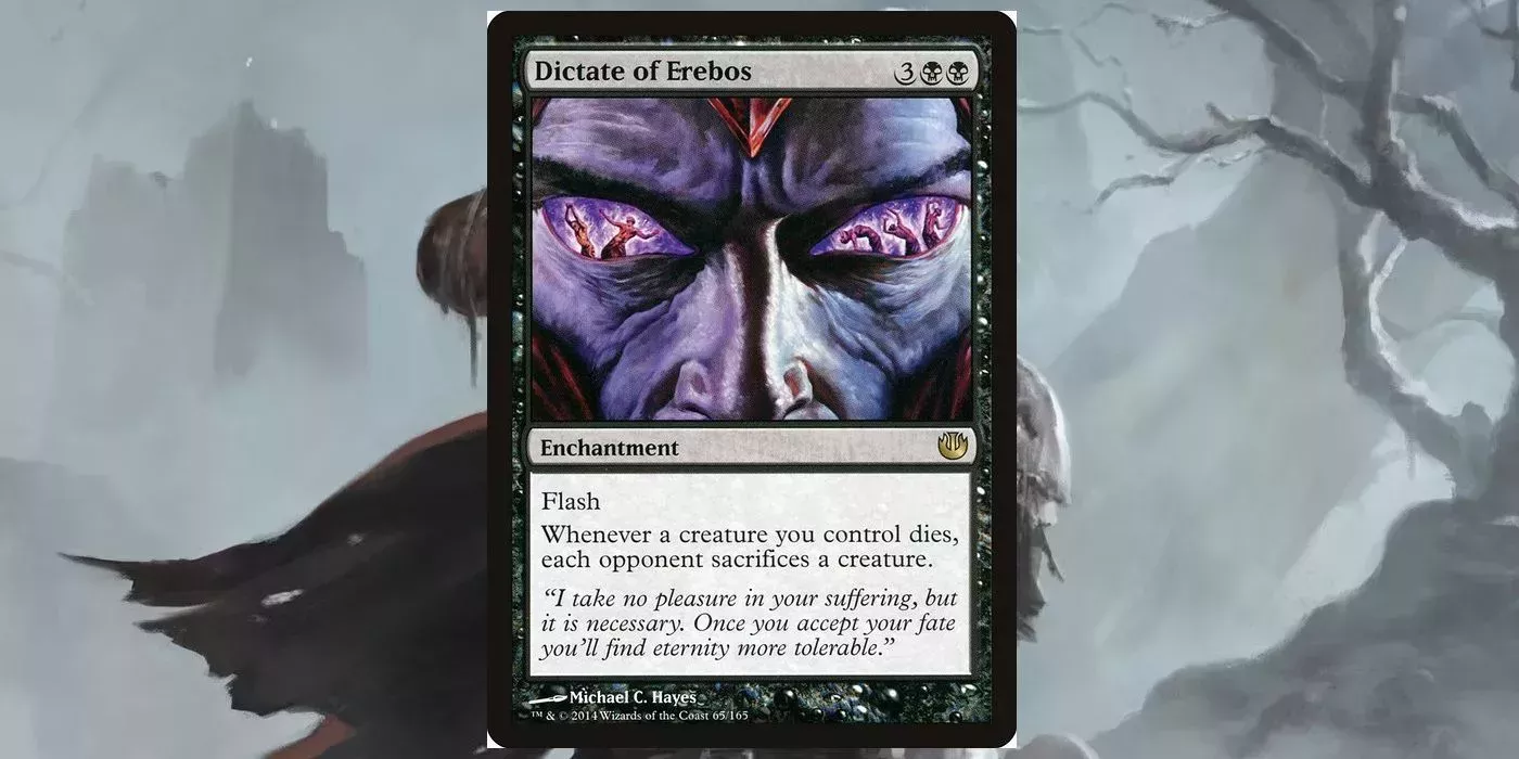 Dictado de Erebos es un formidable encantamiento negro del bloque original de Theros que funciona bien en cualquier mazo que pretenda que sus propias criaturas mueran a menudo. Dictado de Erebos no se diseñó especÃficamente pensando en los zombis, pero las barajas de zombis le pueden dar mucho uso.