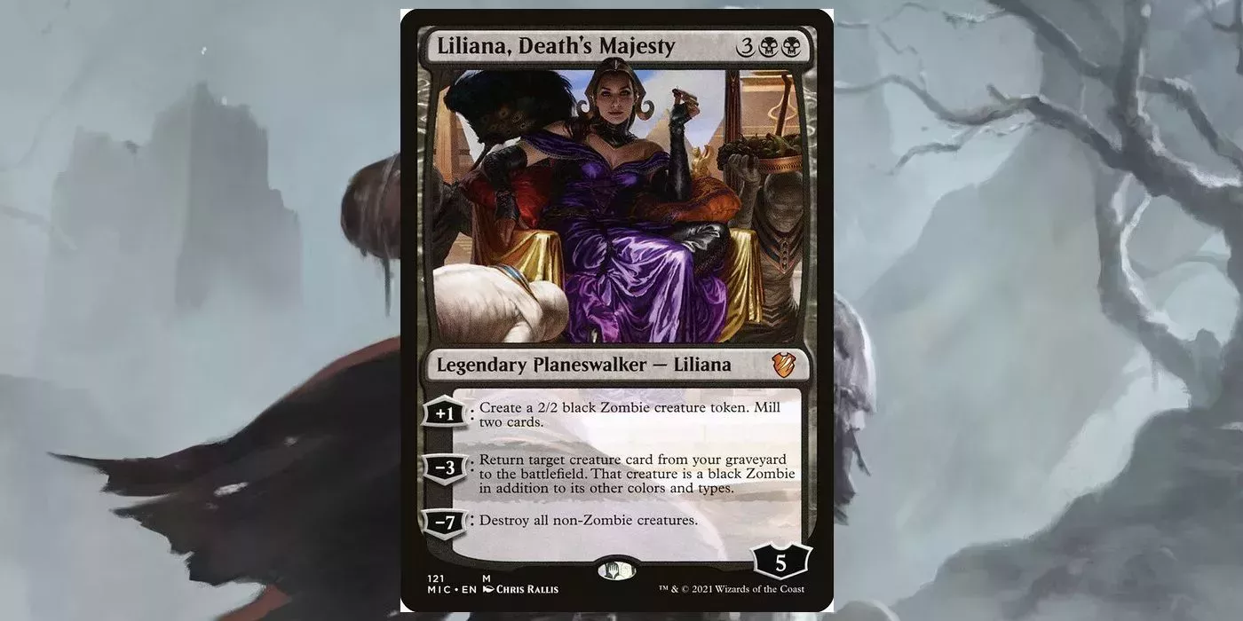 Liliana, Majestad de la Muerte representa al personaje Liliana Vess visitando el mortÃfero mundo desértico de Amonkhet, donde los Zombis momificados están por todas partes. Esta Planeswalker de cinco lanzamientos puede defenderse fácilmente con +1 para conseguir un Zombie 2/2, y muele cartas para abastecer el cementerio más rápido.