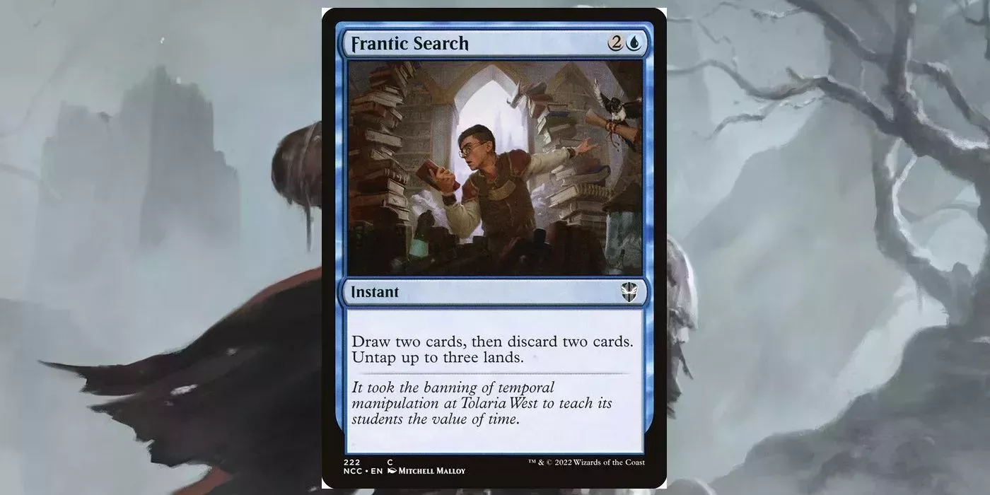 Búsqueda frenética es un simple instantáneo azul que puede ser bastante útil en cualquier mazo, pero los mazos a los que les gusta descartar cartas son los que más provecho le sacan. En un mazo tribal de zombis, por ejemplo, el jugador puede lanzar Búsqueda frenética para robar cartas nuevas y luego descartarse de dos cartas de criatura zombi que quiera reanimar más tarde.