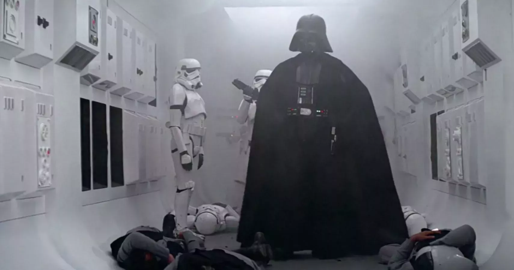 Uno de los mayores villanos del cine se presenta en esta escena, tomando la forma de un hombre imponente con un traje negro que destacaba con crudeza en la nave de paredes blancas. A diferencia de sus subordinados, Vader no es un soldado de asalto, sino un Jedi caído que se deshizo fácilmente de la tripulación de la nave para dar caza a los planos robados de la Estrella de la Muerte.