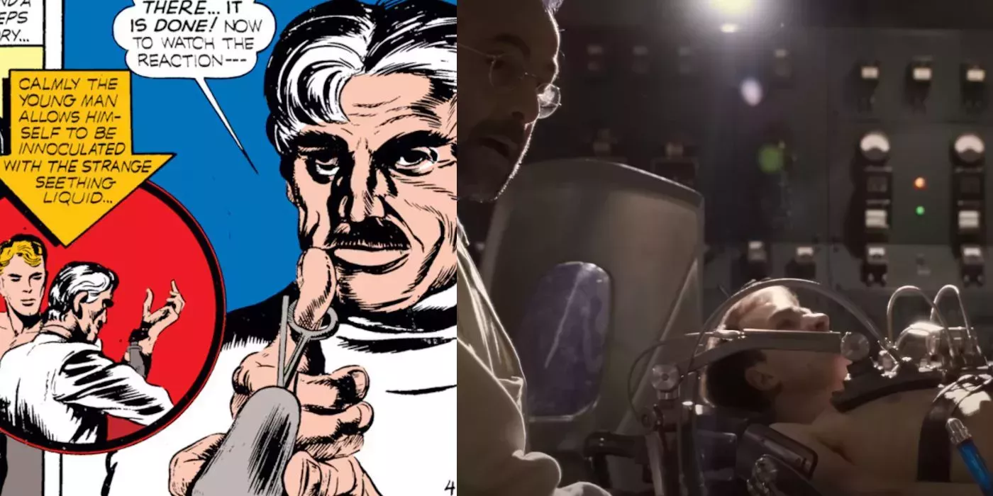La primera imagen de Steve Rogers siendo inyectado por el suero del pobre Dr. Abraham Erskine para convertirse en el Capitán América aparece en el original Captain America Comics nº 1, publicado en diciembre de 1940. Aparte de un puñado de detalles (como la inyección de Steve con varias agujas en una cámara en lugar de una simple jeringuilla), la presencia de Howard Stark es prácticamente la única diferencia.