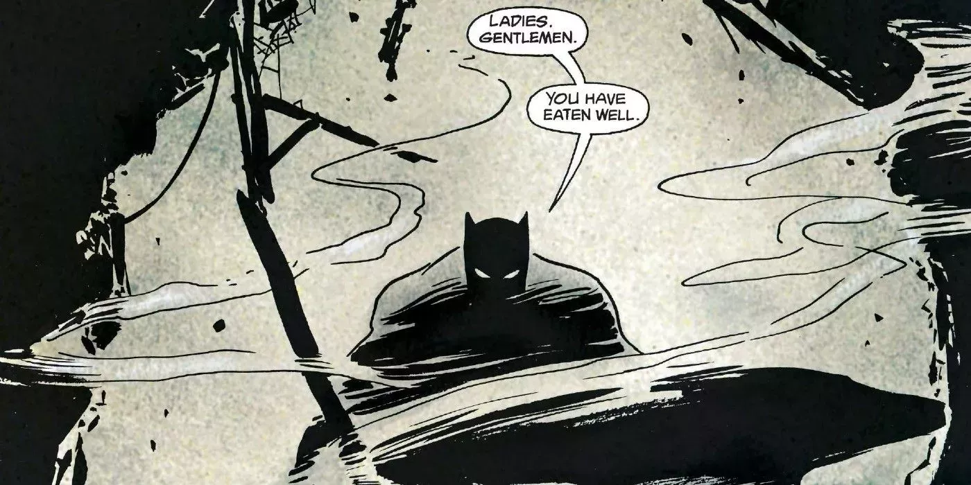 Batman: Año Uno contiene muchas de las mejores frases de Batman cuando el justiciero se está adaptando a su primer año de lucha contra el crimen. Esta frase en particular la dice Batman después de colarse en una fiesta organizada por el poderoso jefe de la mafia de Gotham, Falcone, y forma parte de un discurso más amplio en el que se burla de los invitados de Falcone.
